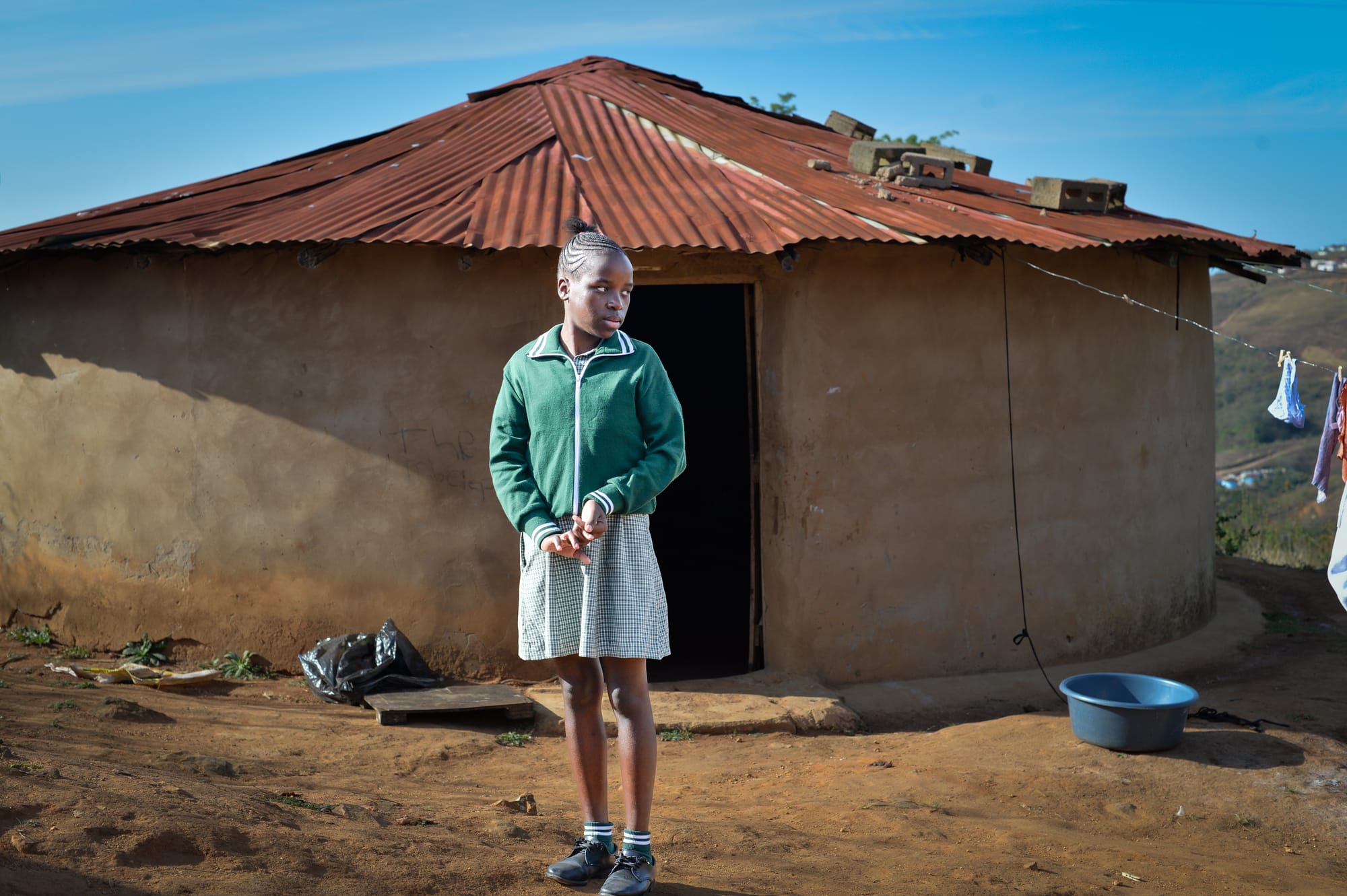 Thando* lives in at the base of a mountain in remote Kwa Zulu Natal. Her home is headed by her eldest sister who is 24, still trying to finish Grade 12 and has a 6-year old child. Thando's elder brother also stays at home. He did not finish high school and cannot find work. Together her family tries to make a living in a very humble home.